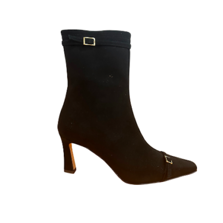• tronchetto in camoscio, zip laterale, fibbie frontali, tacco 80mm