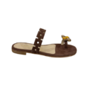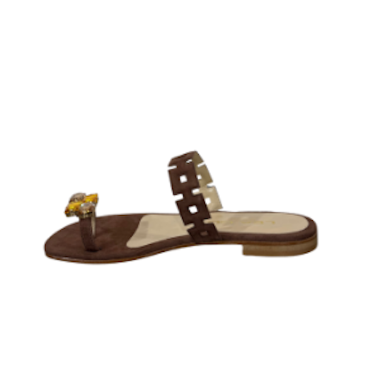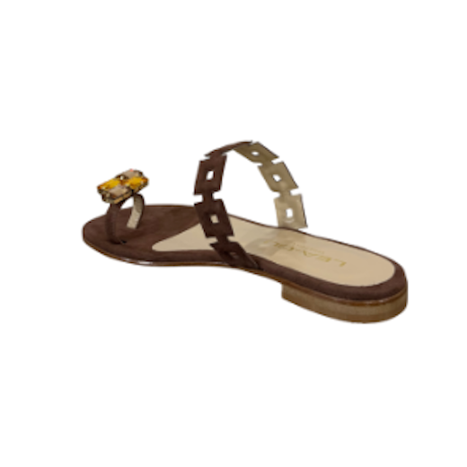Sandalo in camoscio con dettaglio gioiello, perfetto per completare i tuoi look estivi con stile. Presenta una fascia frontale e infradito impreziosito da un gioiello. Suola in cuoio e tacco 10mm.