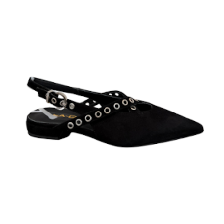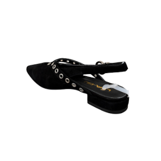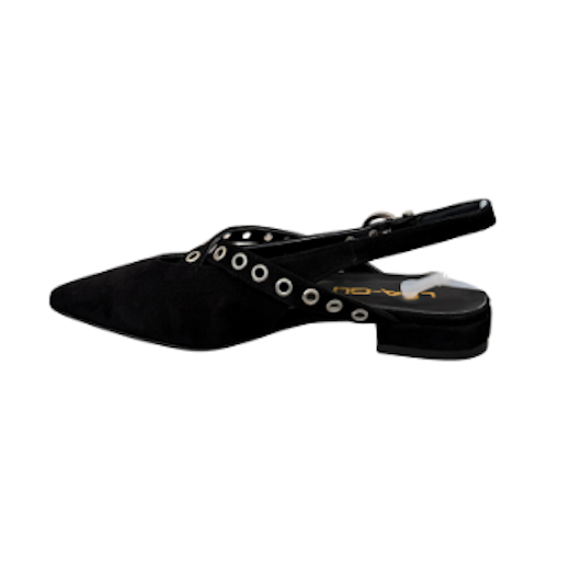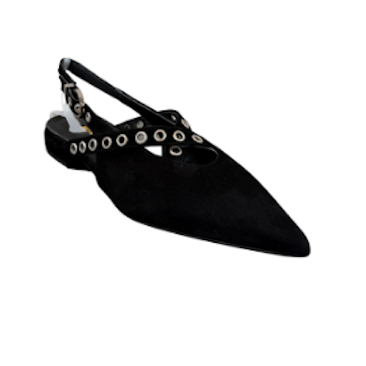 Slingback in camoscio con cinturino e borchie, perfetto per completare i tuoi look con stile. La punta affusolata dona un tocco sofisticato, mentre i cinturini con borchie metalliche aggiungono un tocco di carattere. Suola in tunit e tacco 10mm.